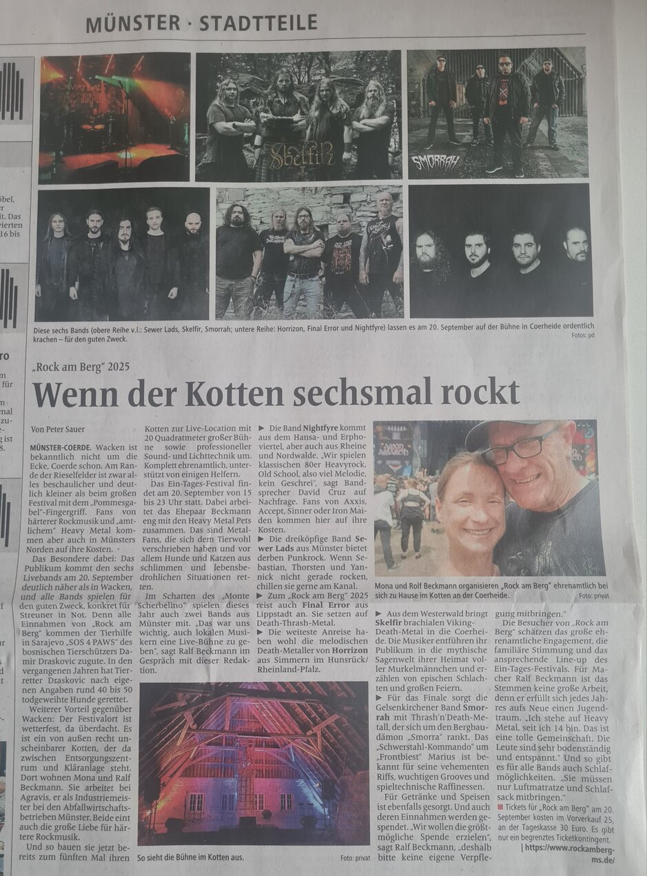 Am 19.09.2026 findet zum sechsten Mal das „Rock am Berg“-Festival in Münster statt. Alle auftretenden Bands spielen ohne Gage. Das Festival dient dem Zweck, Spenden für die Obdachlosenhilfe in Münster und Straßenhunde und -katzen in Sarajevo zu generieren, wo Damir Draskovic mit seiner Tierhilfe SOS 4 Paws seit vielen Jahren als Tierschützer aktiv ist. Dabei arbeiten wir eng mit den Heavy Metal Pets zusammen. Wir erzielen keinen Gewinn. Alle Beteiligten und Helfer bringen sich mit ihrem Engagement ehrenamtlich ein, danke dafür im Voraus.